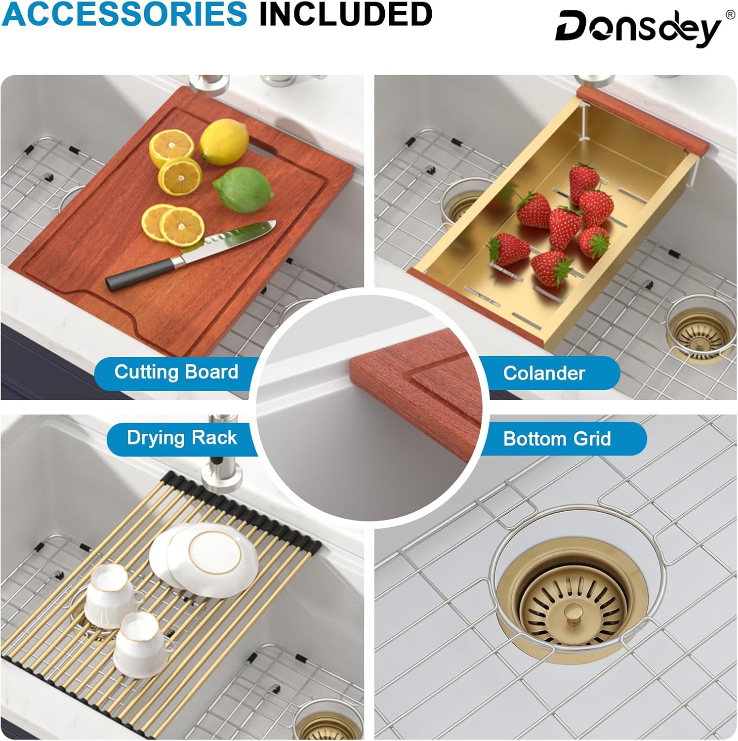 - Single Deep Bowl: Large single bowl gold accessories kitchen sink with advanced noise reduction technology ensures quiet dishwashing, creating a peaceful, efficient workflow in your kitchen.