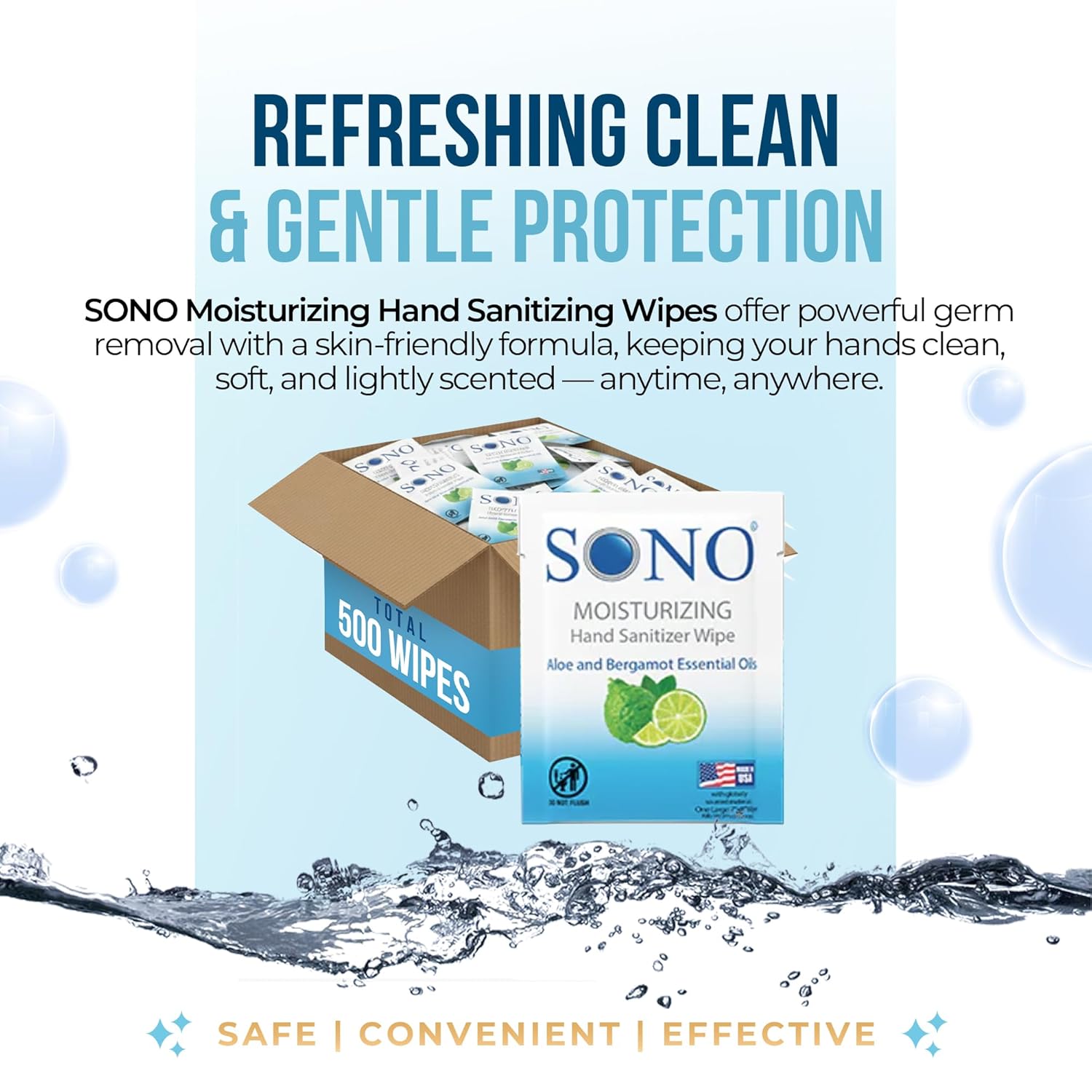 SONO Alcohol-Free Sanitizing Hand Wipes with Bergamot & Aloe Essential Oil - Hospital-Grade Disinfectant - Individually Wrapped Travel Size - 500 Pack - Gentle Cleaning & Germ Protection Anywhere