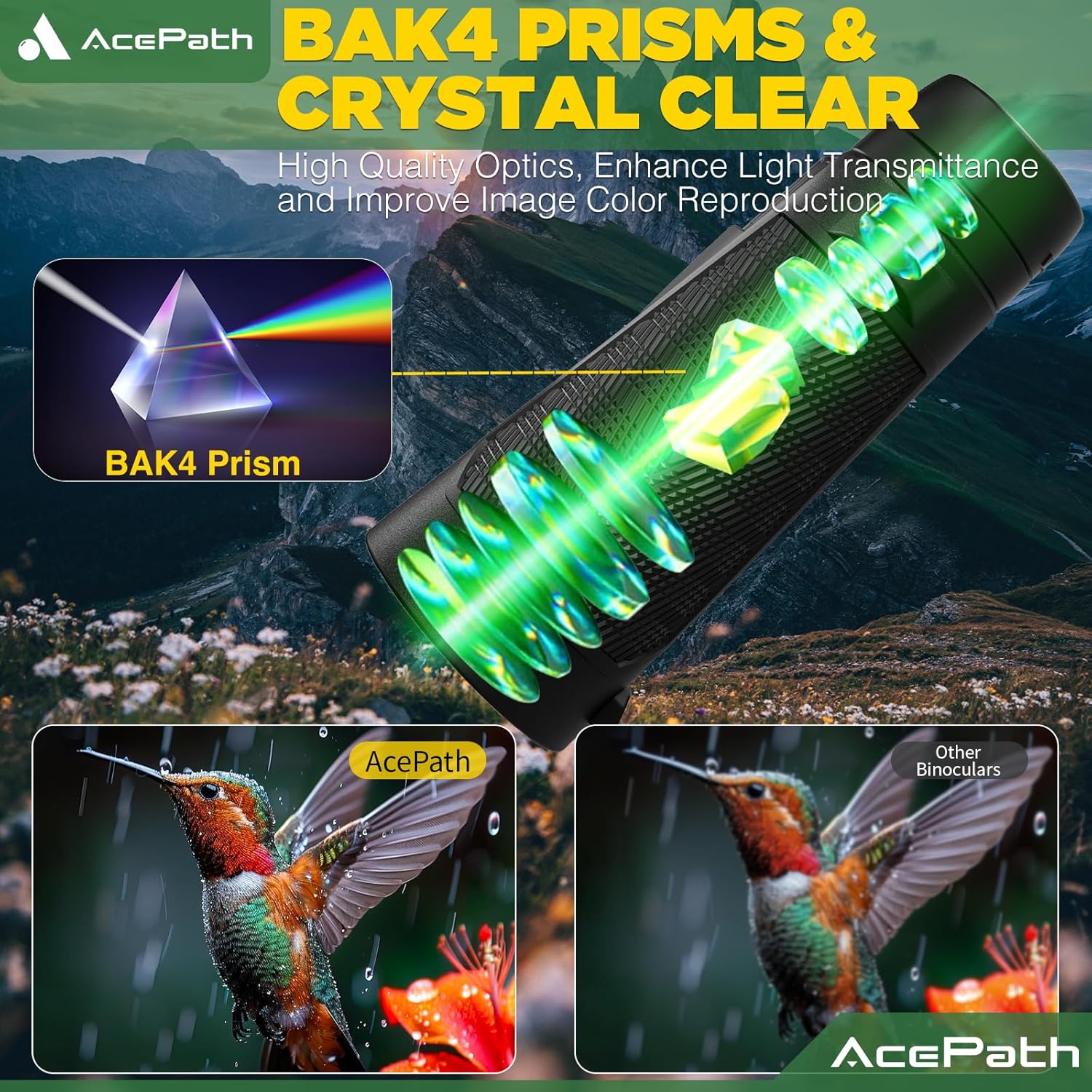 - COMPACT POWERHOUSE - AcePath binoculars pack 15x magnification into a 56mm objective lens, delivering a 315ft/1000-yard field of view while weighing only 1lb. The 20mm eyepiece ensures crisp, distortion-free images — It's an ideal gear for camping, travel, cruise, bird watching, hunting, hiking, opera, concert, sports events, and stargazing.