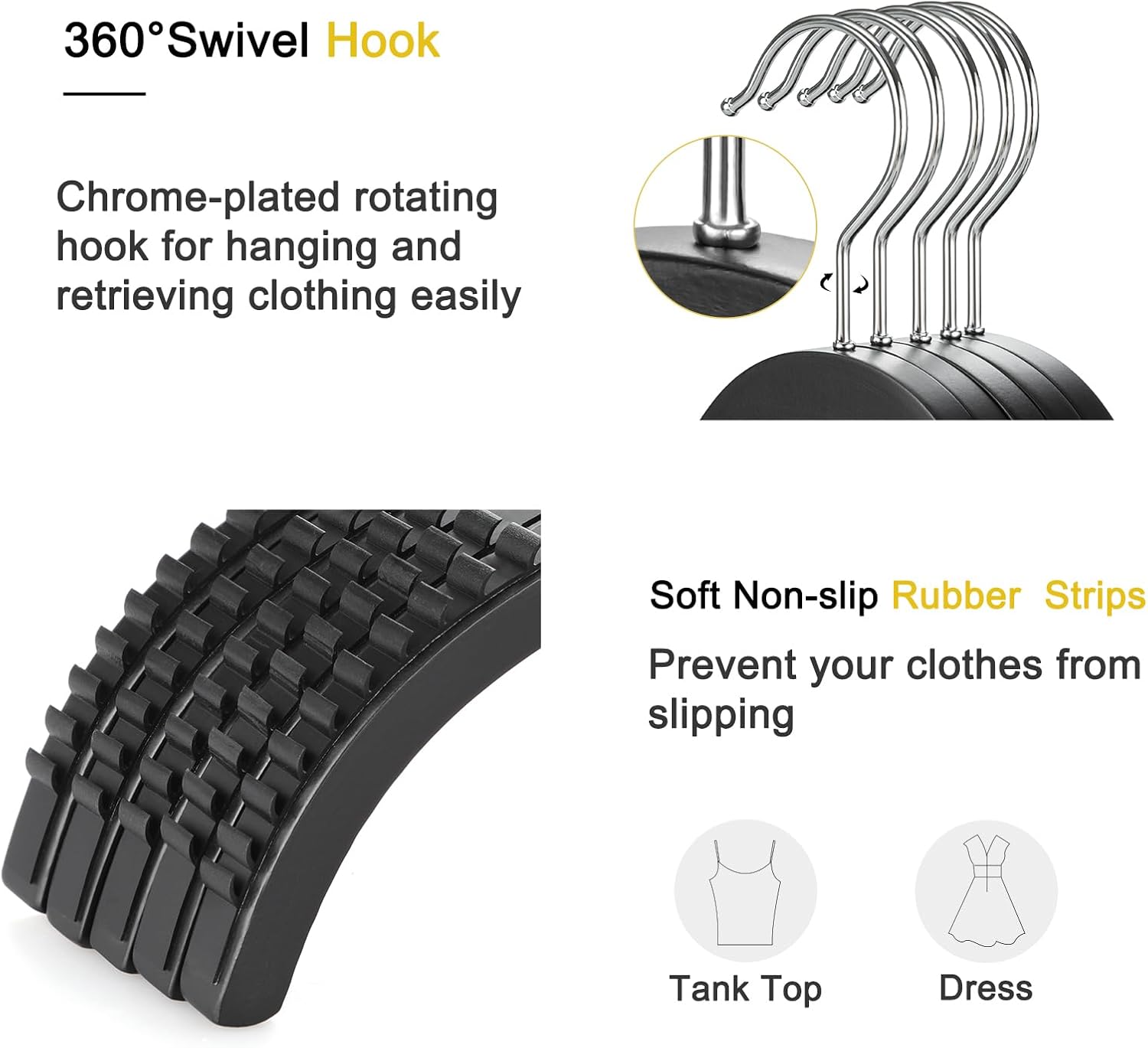 - Non-Slip Rubber Strips: Soft rubber tipped on the shoulders of the Hangers prevent clothes from falling, making the hanger suitable for strap dresses, camisoles or other wide necked clothing