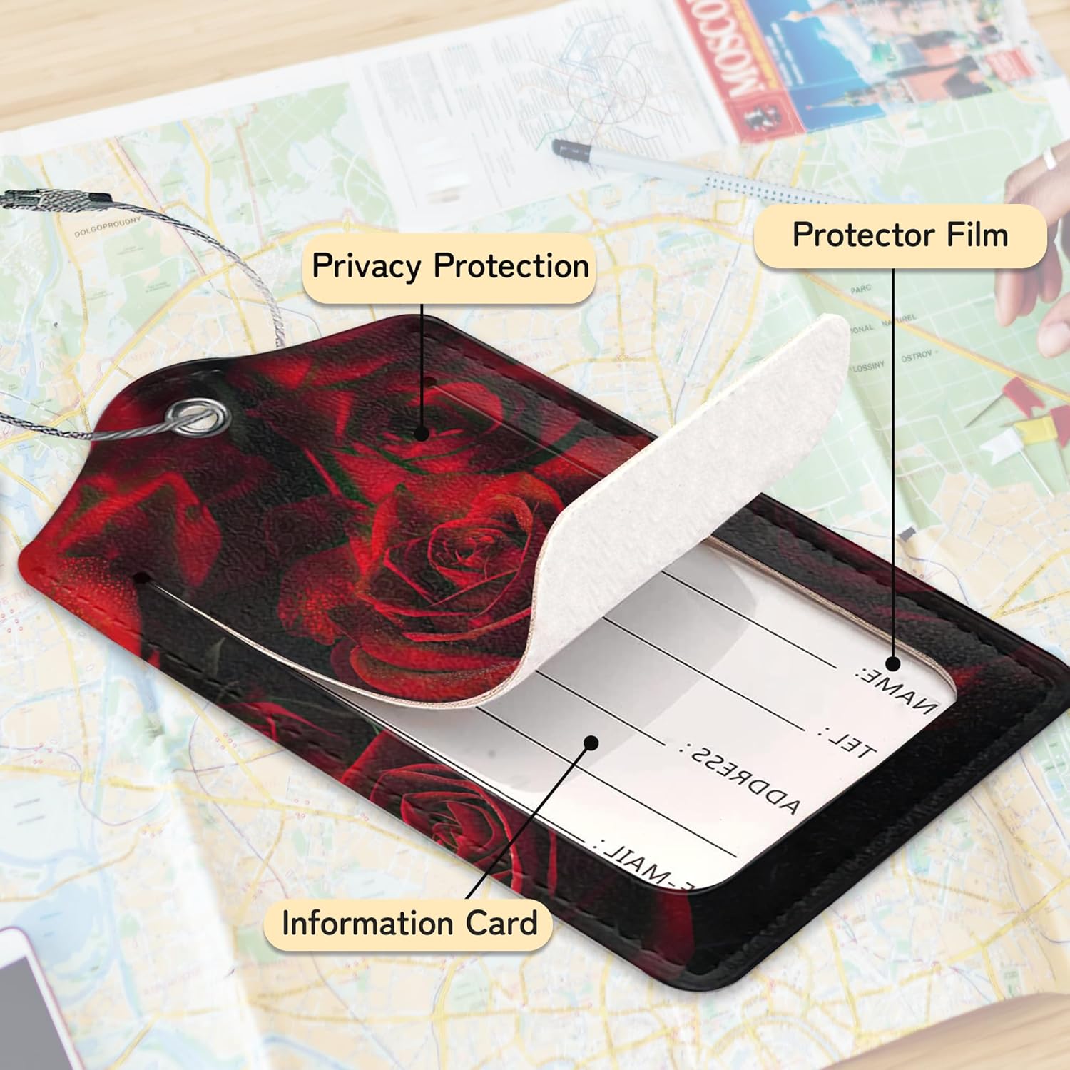 3 Pack Red Rose Luggage Tags for Suitcases, Cute Leather Name Tag with Privacy Cover with Stainless Steel Loops, Travel ID Bag Tags for Women Men