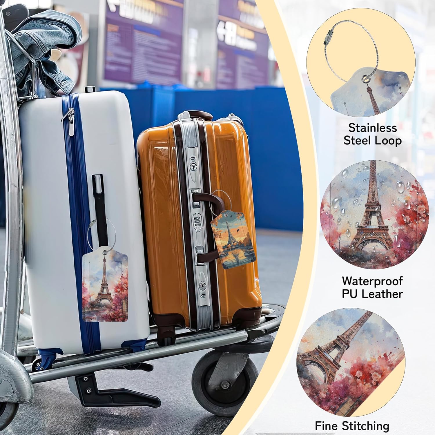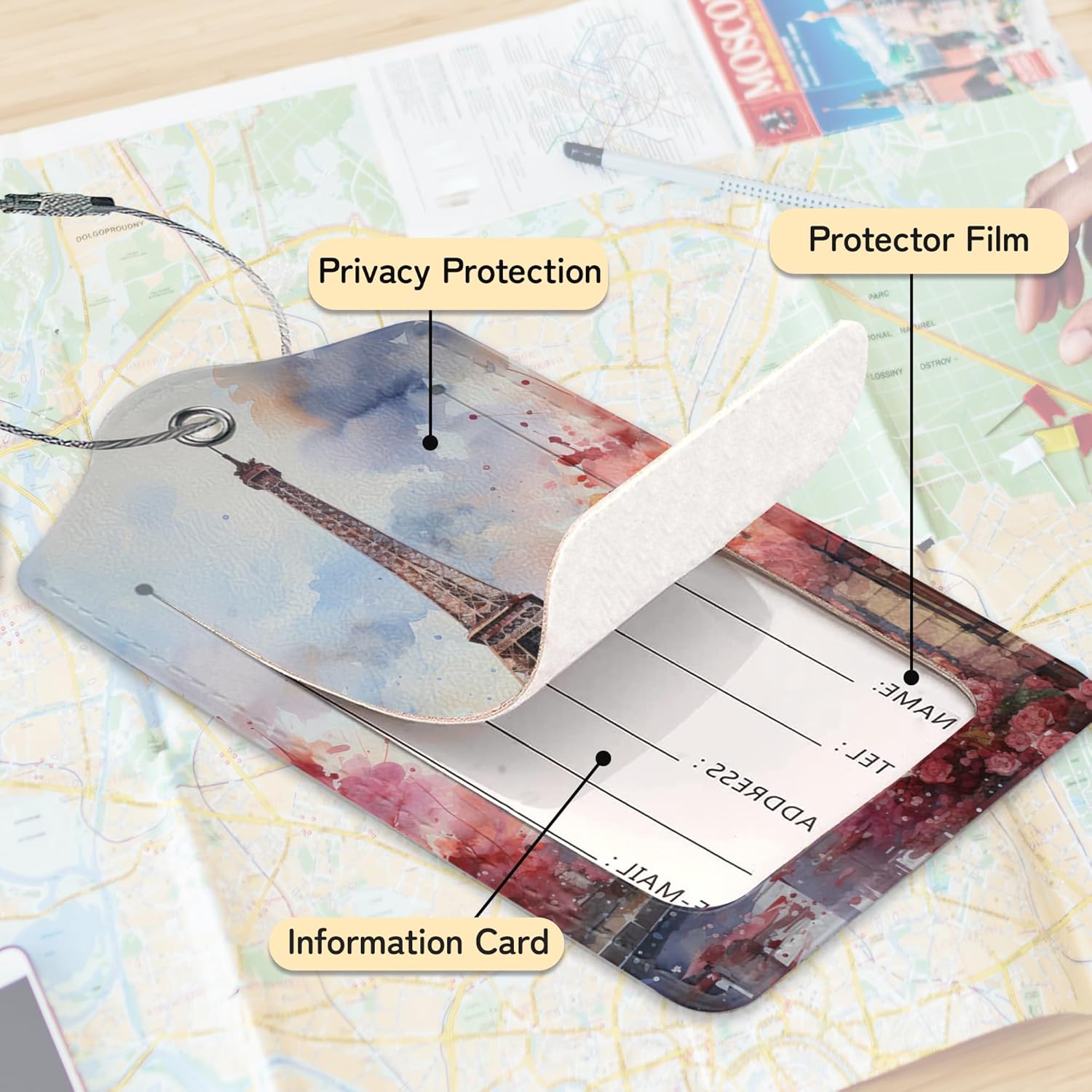 3 Pack Eiffel Tower Luggage Tags for Suitcases, Paris Cute Leather Name Tag with Privacy Cover with Stainless Steel Loops, Travel ID Bag Tags for Women Men