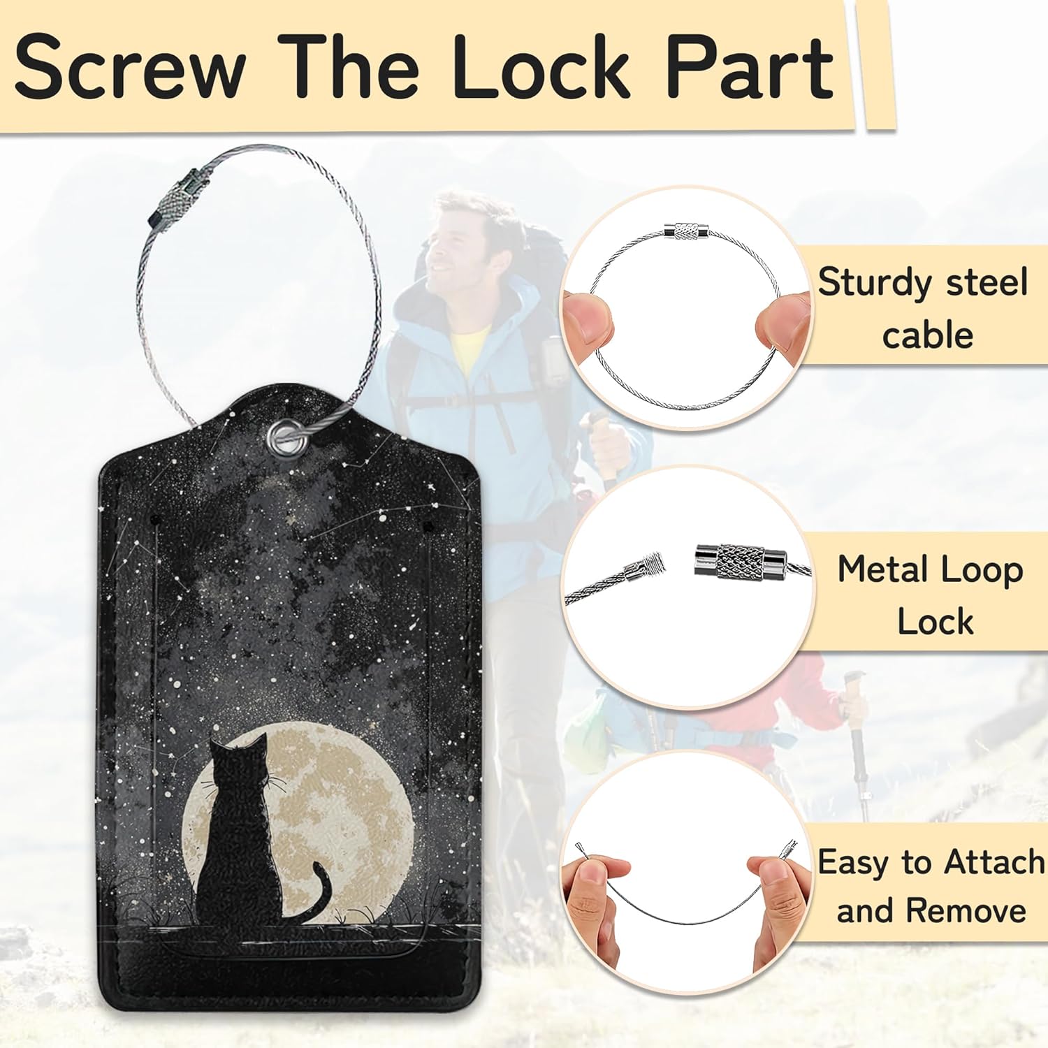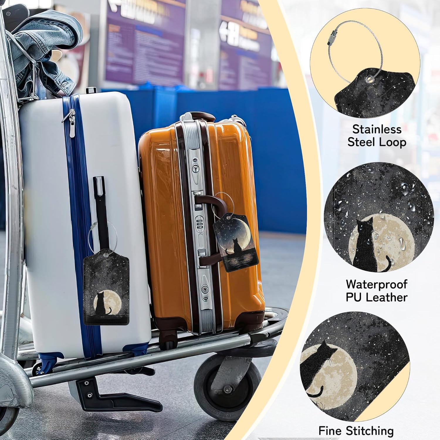 3 Pack Black Cat Luggage Tags for Suitcases, Moon Night Cute Leather Name Tag with Privacy Cover with Stainless Steel Loops, Travel ID Bag Tags for Women Men
