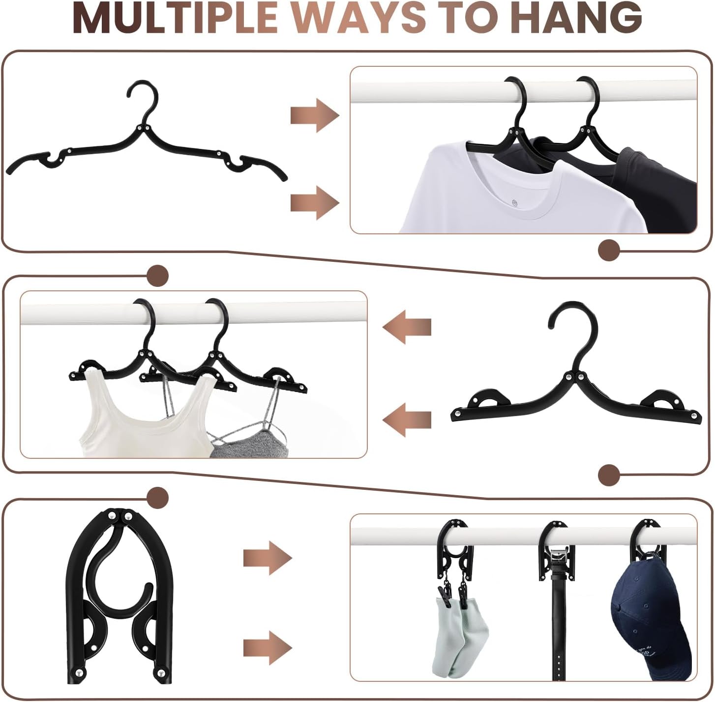 - Innovative 3-Part Folding Design for Multi-Use: Fully expanded—fits most adult clothing; half-unfolded—perfect for baby clothes, tank tops, bras, etc.; fully folded—ideal for storing hats, belts, and small accessories. This travel essential hanger meets all your hanging/storage needs with simple adjustments.