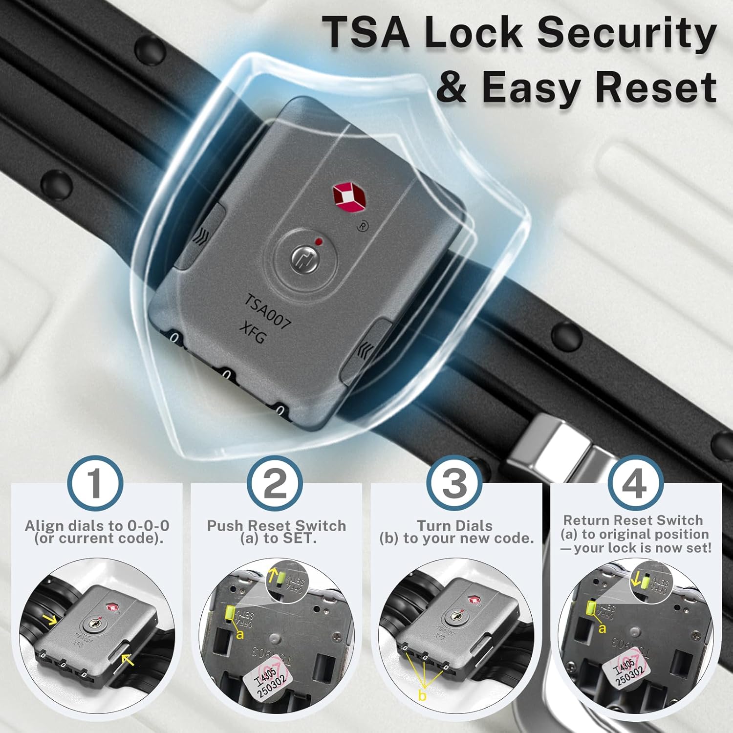 • 【TSA Lock Protects Luggage Security】Featuring a sturdy TSA lock, the suitcase enhances the security of your luggage during travel. (TSA locks do not come with keys). Its zipperless design protects belongings from unauthorized access.The zipperless design allows you to easily open the suitcase to find what you need in noisy environments without the need to go around the case a whole circle like a zip suitcase for you to open it.