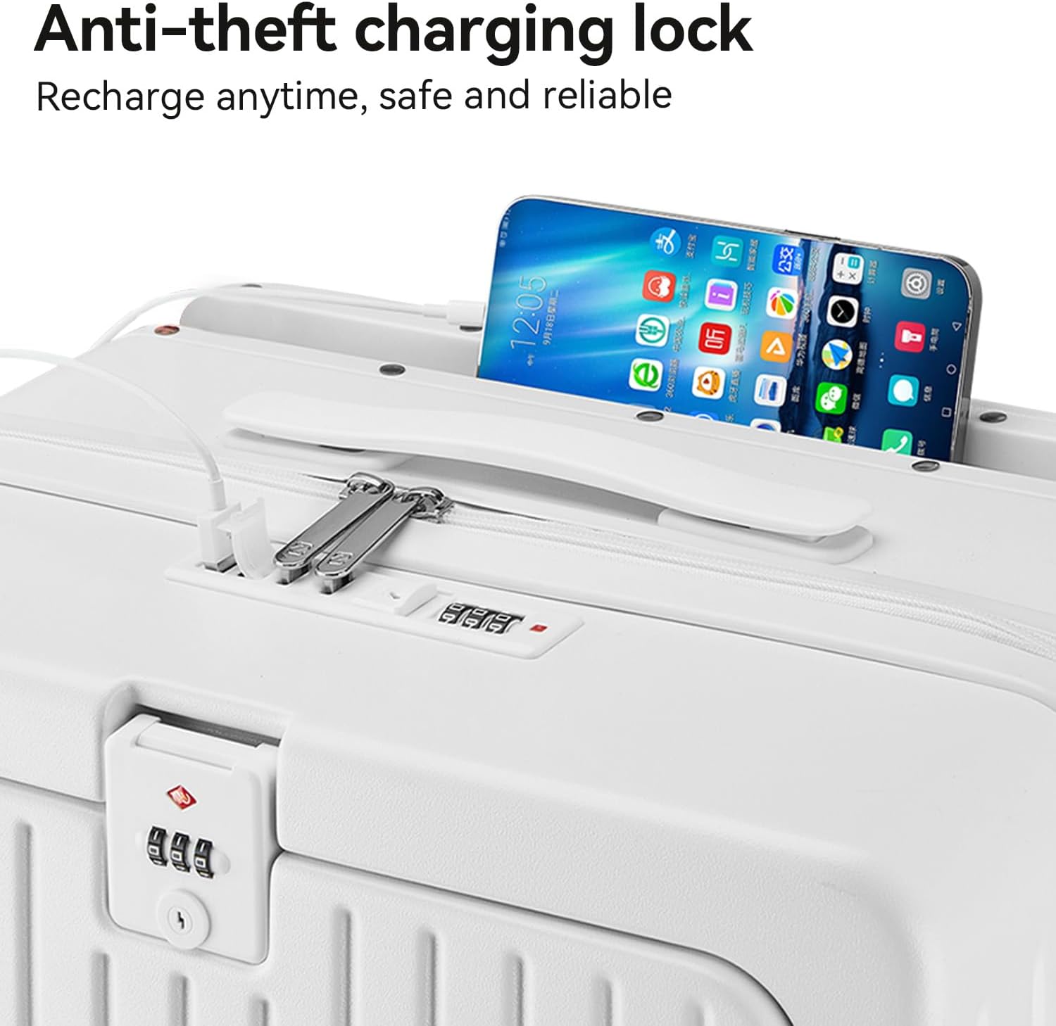 - 【HUMANIZED DESIGN】The travel luggage is equipped with a dry wet separation layer, making your items healthy and organized. The password lock of the luggage suitcase comes with USB and Type-C charging ports, which can provide great convenience for your travel while ensuring safety. Please note that you need to bring your own power bank. The pull rod of the front opening carry on luggage can be adjusted in multiple levels to easily customize for users of different heights.