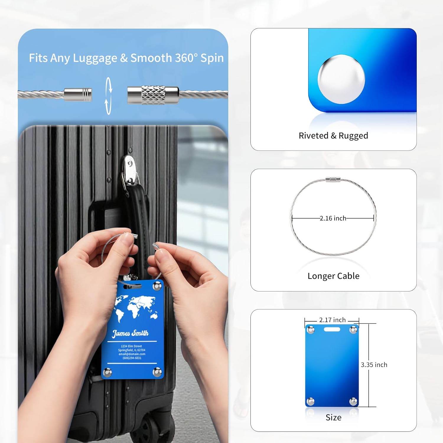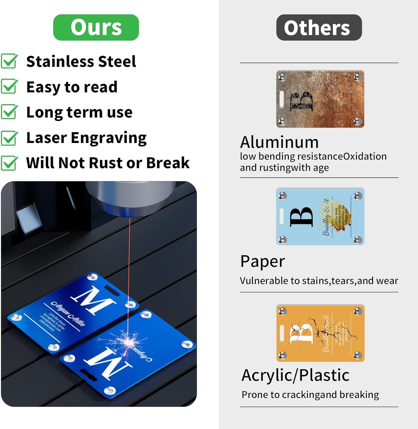 - DURABLE TRAVEL TAGS FOR LUGGAGE: Measuring 3.35" x 2.17", these metal luggage tags are crafted from stainless steel with a smooth finish, resistant to wear and tear. Each comes with a sturdy steel loop, ensuring your name tags for luggage stay firmly attached during flights, cruises, or daily commutes.